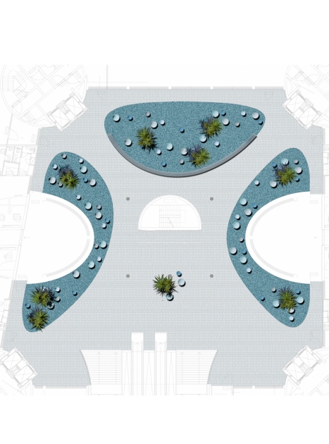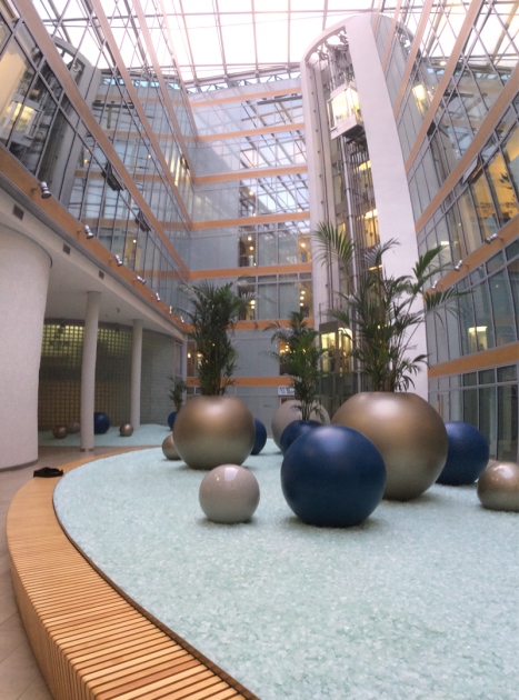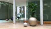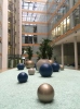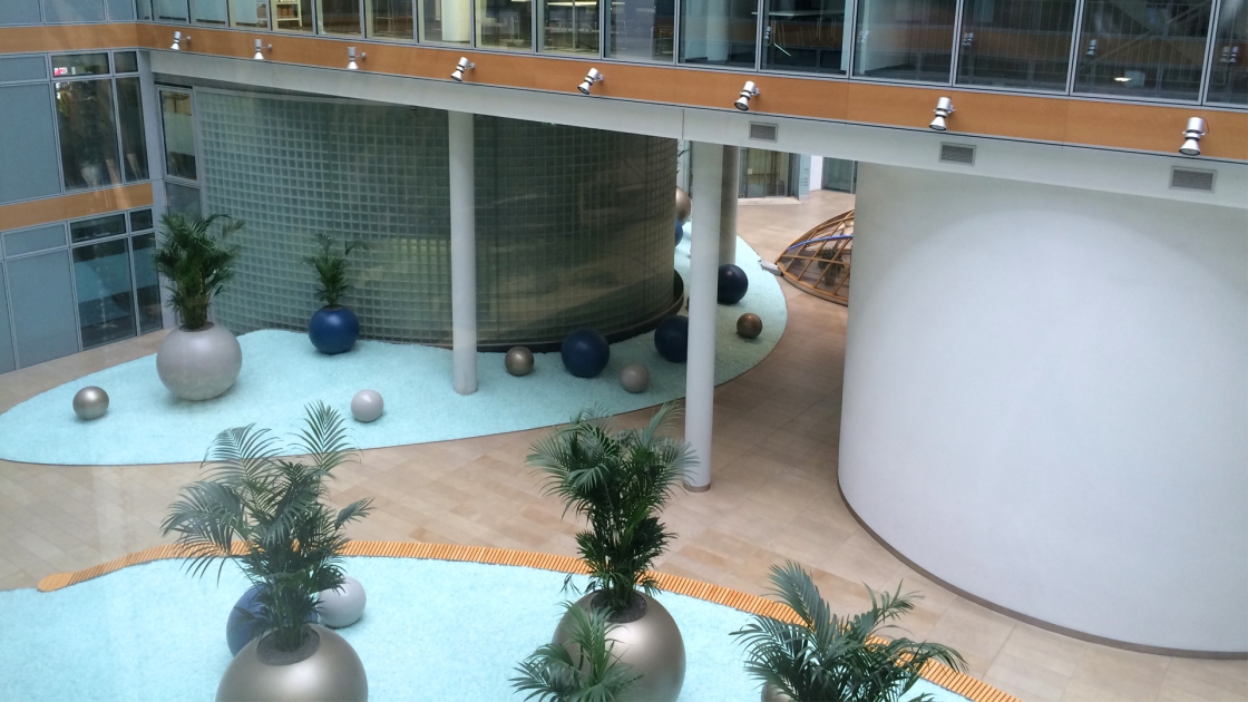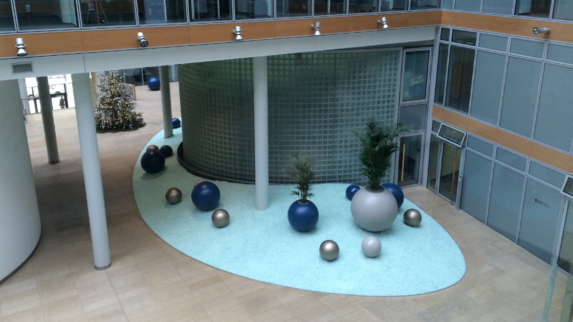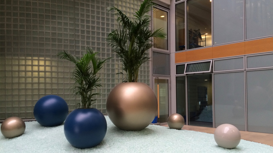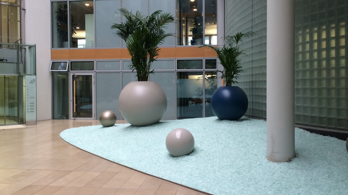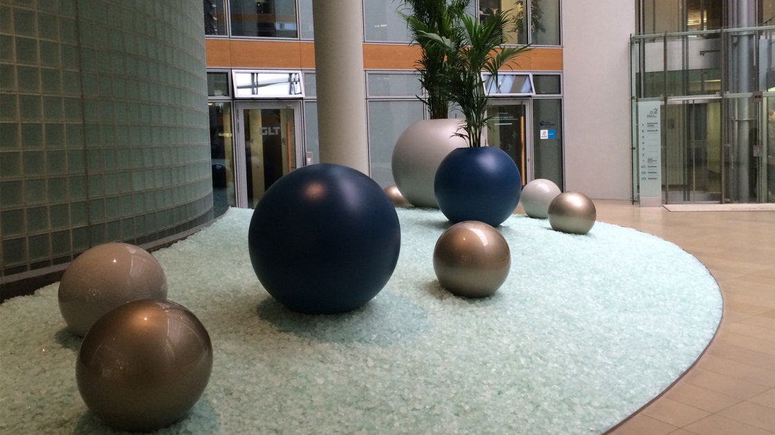 Das Atrium des DomAquarée Berlin schafft durch den Einsatz von großen, glasfaserverstärkten, lackierten Kugeln in den Logofarben des Unternehmens einen farbigen Willkommensgruß an Besucher. Vereinzelte Kugeln dienen gleichzeitig als Pflanzgefäße und bilden so ein durchgrüntes Gesamtbild am Entrée. Durch die Modellierung des Gestaltungsflächen kommen die Kugeln auf verschiedenen Höhen zum liegen und bilden ein spannungsreiches Gesamtbild.