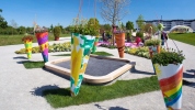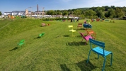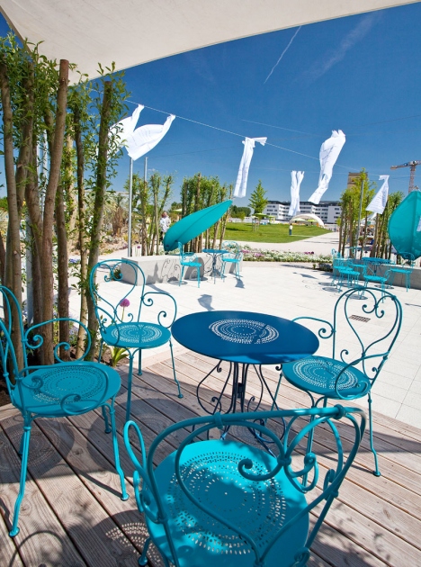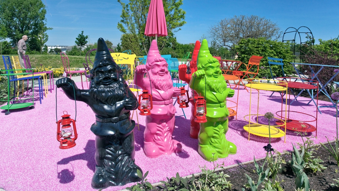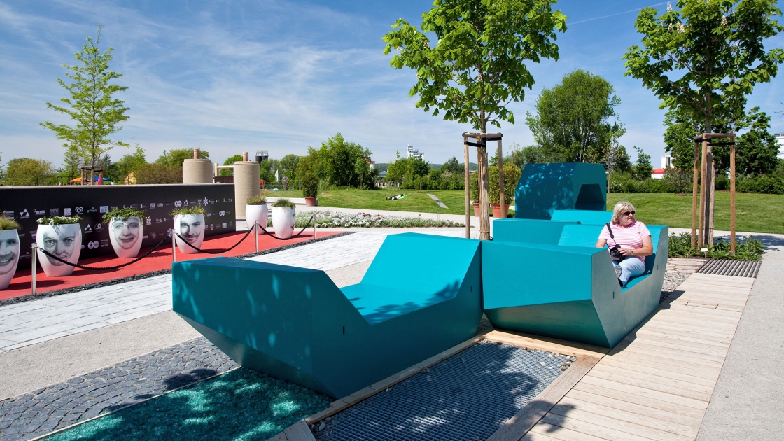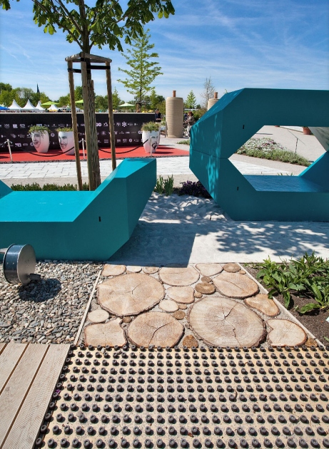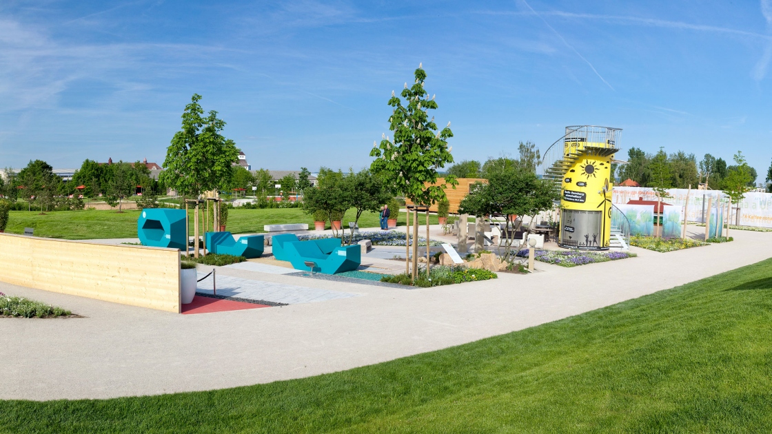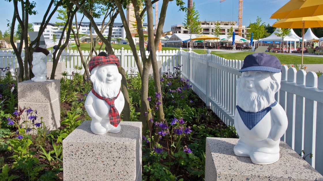 Ein Turm und andere Reste der früheren Werkshallen werden einbezogen und inszeniert. Als besondere Elemente entstehen die „Patchworkgärten“, in denen zusammen mit kreativen Berufsgruppen und besonderen Bamberger Firmen ungewöhnliche, experimentelle Gärten entstehen. Wie eine Patchworkdecke rahmen sie eine weite, wie ein Tuch gewellte Rasenfläche.