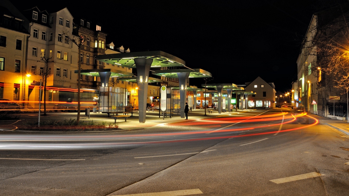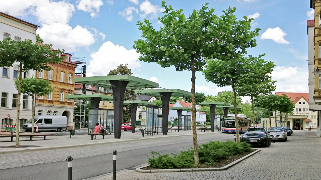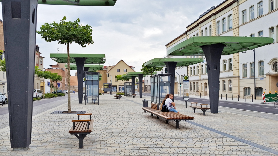 Zunächst wurde der zentrale Busbahnhof verlegt und neu gestaltet. Er fügt sich nun mit einer künstlerisch gestalteten Überdachung und der hochwertigen Ausstattung in das historische Zentrum.