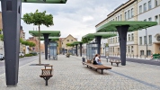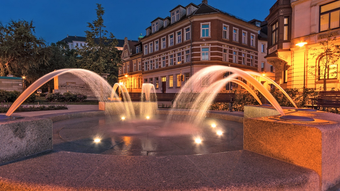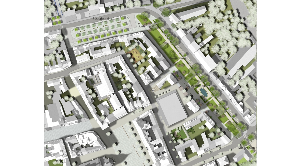 Anschließend konnte die Promenade als durchgehender grüner Brückenschlag zwischen dem Bahnhof und dem Schlossberg gestaltet werden. Eine Brunnenanlage bildet den lebendigen Mittelpunkt der Anlage.