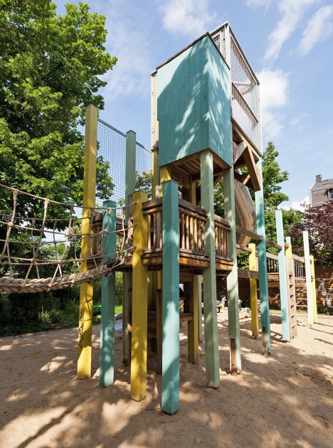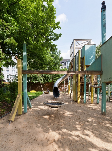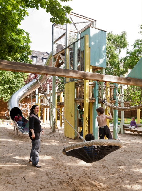 In drei unterschiedlichen Bereichen können sie sich sowohl austoben wie auch zurückziehen. Das Bild vom „Affenstall“ wird hier ironisch aufgegriffen und mit seinen typischen Elementen zum Klettern, Kraxeln, Schaukeln, Gaukeln, Abhängen und Herumfläzen spielerisch umgesetzt.