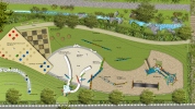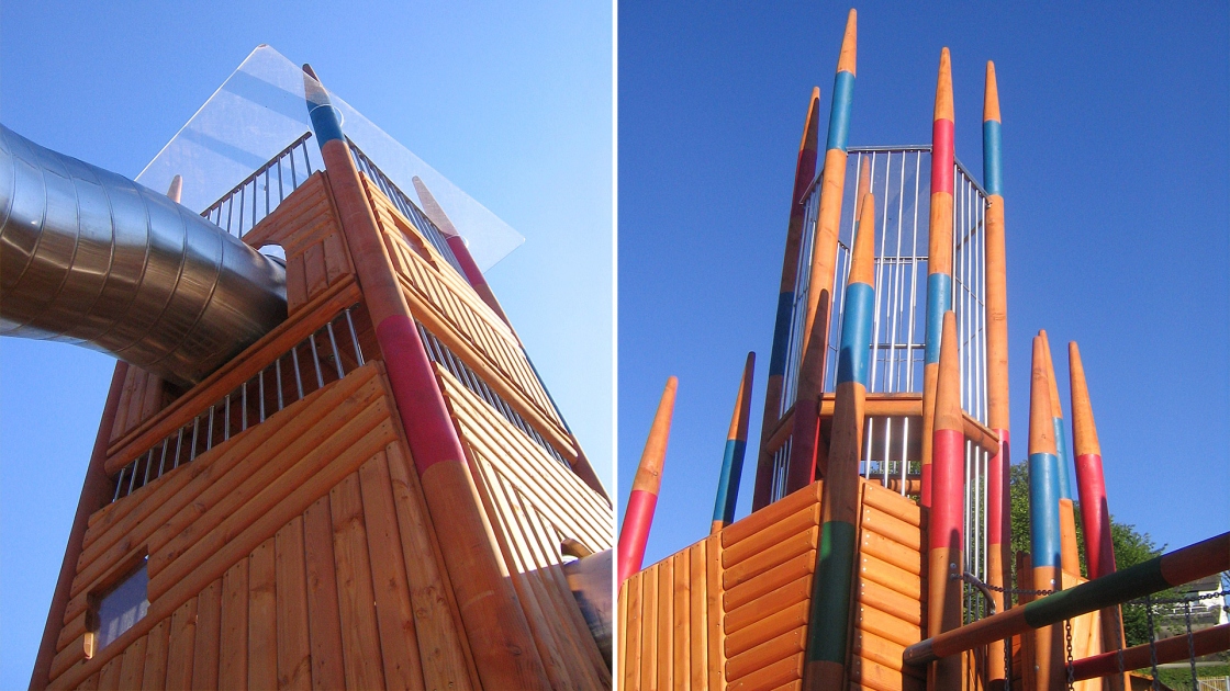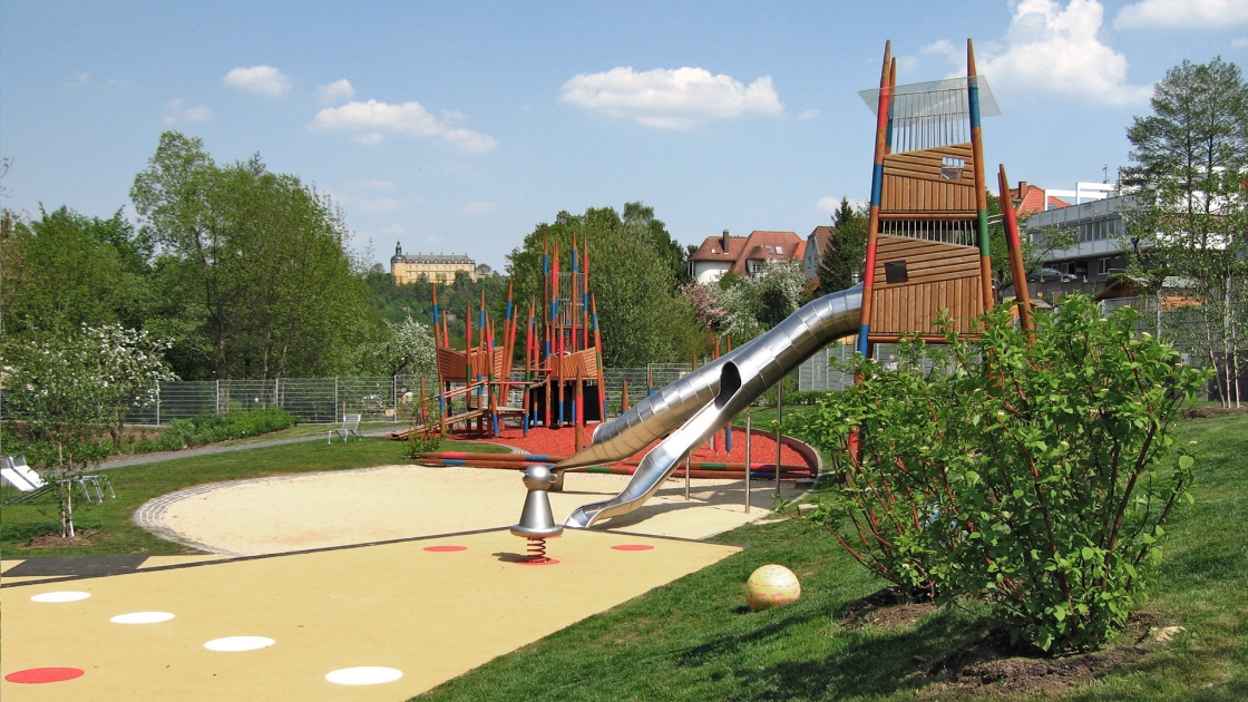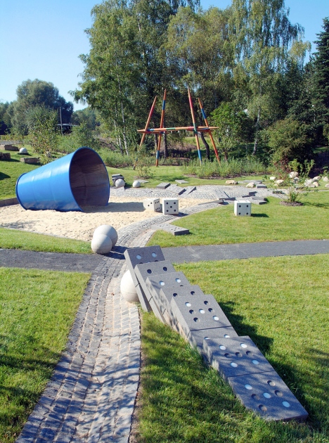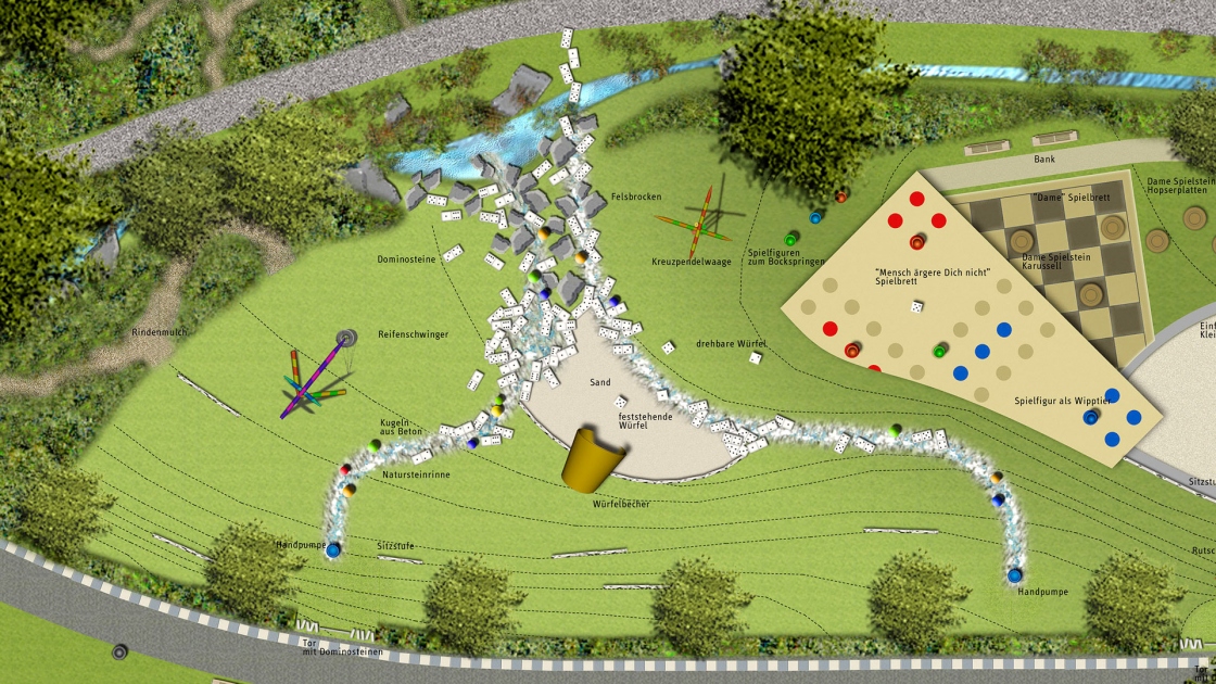 Der Spielplatz liegt im Übergangsbereich einer Auenlandschaft zum Park. Die eingestreute, künstlerisch gestaltete Spielinsel bildet einen bewussten Kontrast zum Naturraum. Die Spielthemen sind klassischen Brettspielen nachempfunden und wie eine ausgeleerte Spielkiste über das Gelände verteilt. Der Spielplatz wurde im November 2007 mit dem 1. Rang beim Deutschen Spielraumpreis ausgezeichnet.