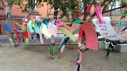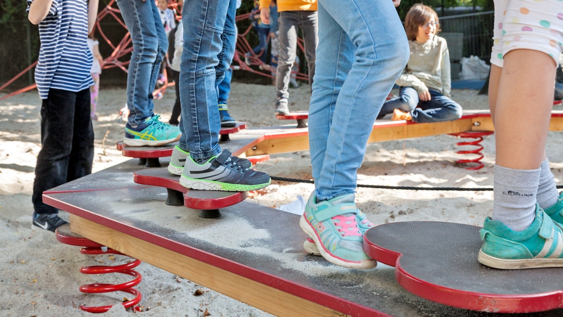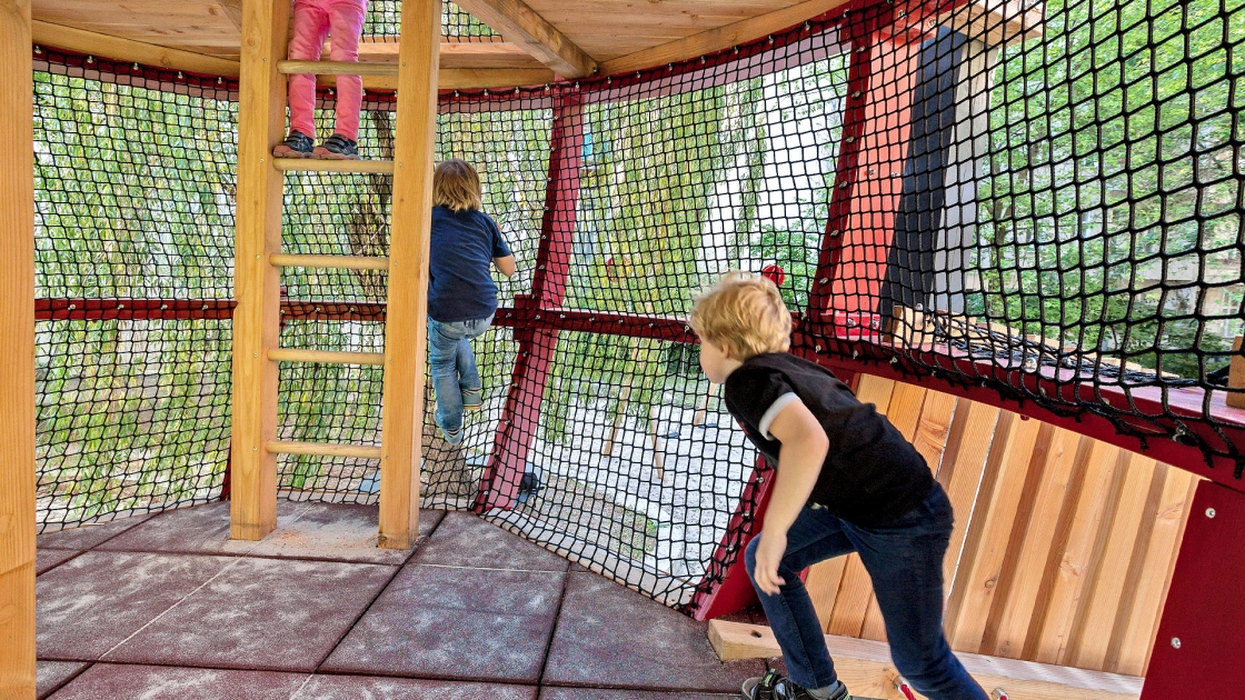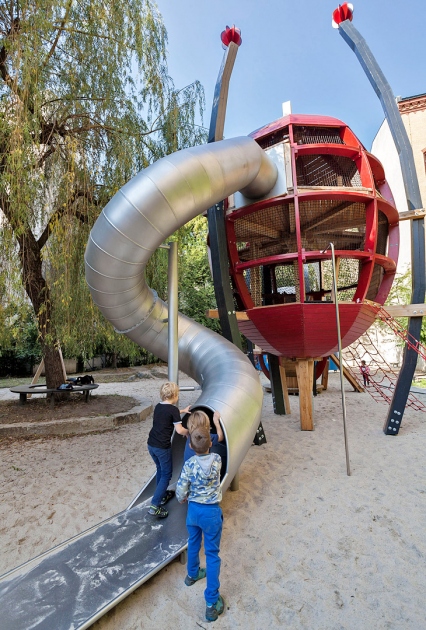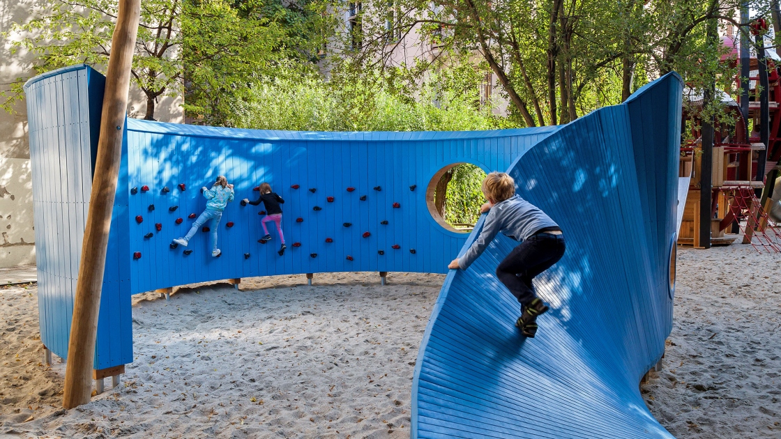 Gemeinsam griffen wir die Wünsche, Skizzen und Modelle der Kinder auf und entwickelten daraus Spielgeräte und Ausstattungsgegenstände, die an die Form- und Bilderwelt Mirós angelehnt sind. Ein blaues Band, als Symbol für einen Fluss, verbindet die unterschiedlichen Bereiche miteinander. An dem blauen Band liegen die Spielbereiche als Inseln verteilt.