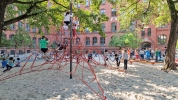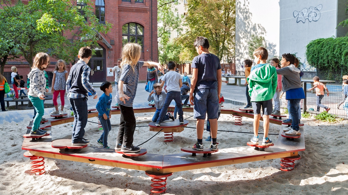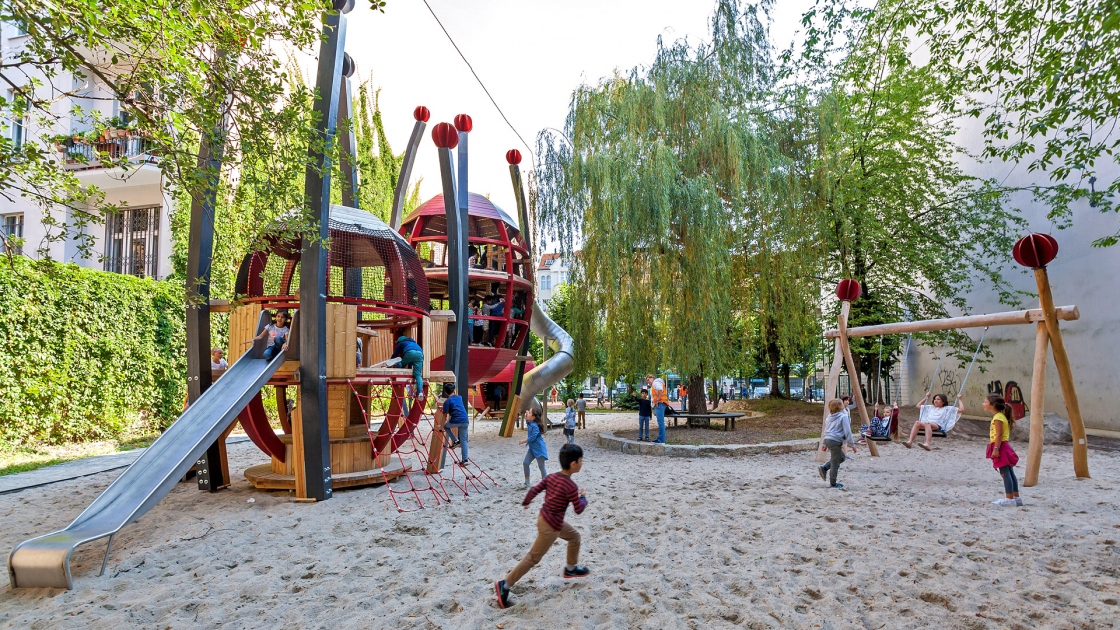 Die Joan-Miró-Grundschule vereint unter ihrem Dach eine Regelschule und eine staatliche Europa-Schule in Form einer gebundenen Ganztagsschule. Für die rund 800 Schüler stehen drei Pausenhöfe und ein öffentlicher, gegenüber liegender Spielplatz in unmittelbarer Nachbarschaft als Aufenthalts- und Spielfläche zur Verfügung. Mit der Umgestaltung sollten die gestalterischen und funktionalen Defizite beider Flächen behoben werden.