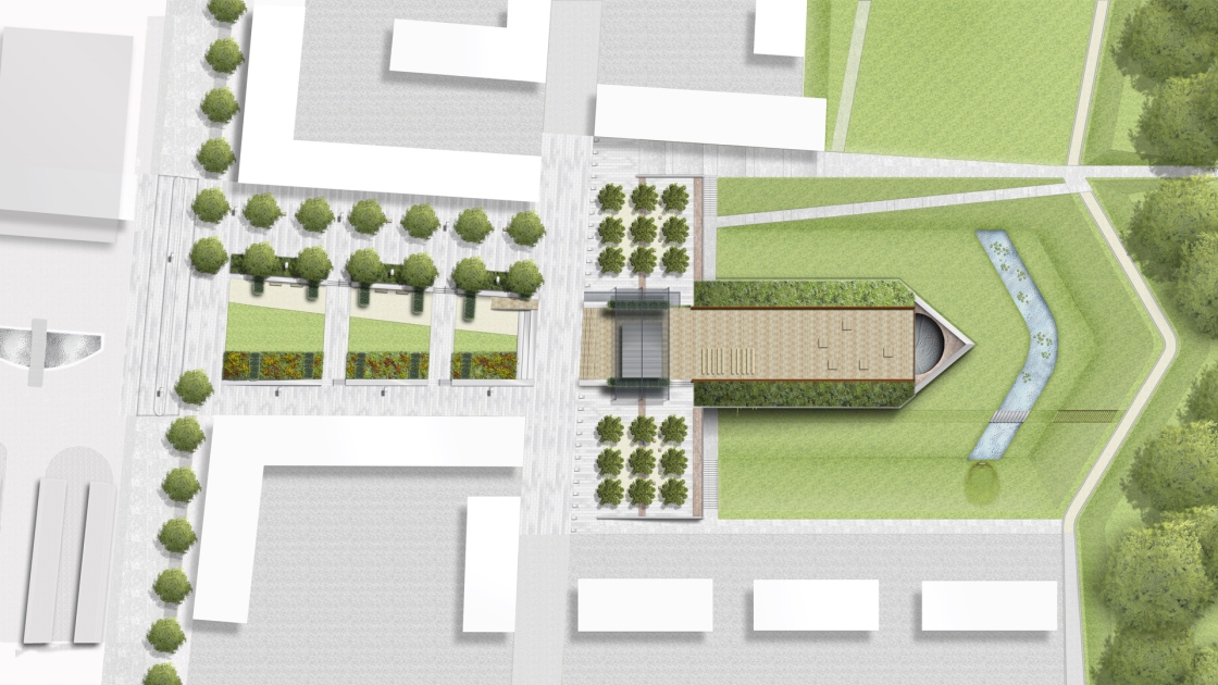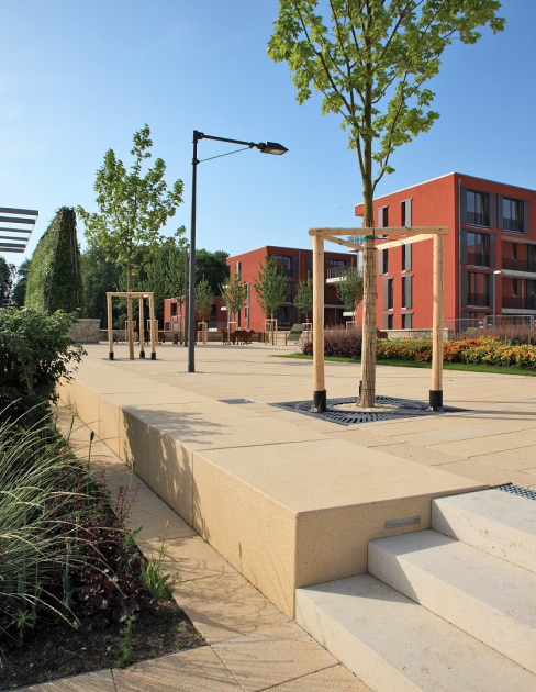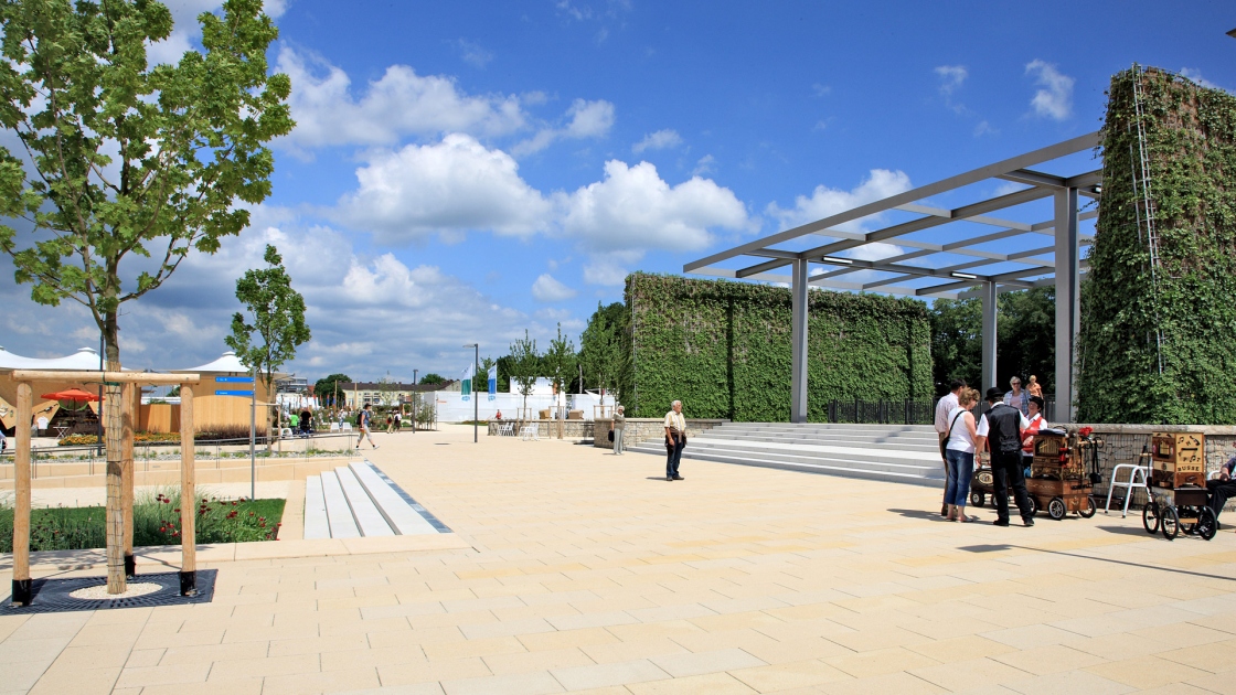 Der Theodor-von-Hildebrandt-Platz am neuen Bahnhof Neu-Ulm wurde zur Visitenkarte der Stadt. Er inszeniert den Übergang von der neu gebauten Stadterweiterung zu den Resten der historischen Wallanlage. Zur Gartenschau 2008 bildete der Platz den innerstädtischen Eingang. Ein ruhiges, abgesenktes „Parterre“ wird beidseitig flankiert von Durchgangsbereichen entlang der späteren Neubebauung.